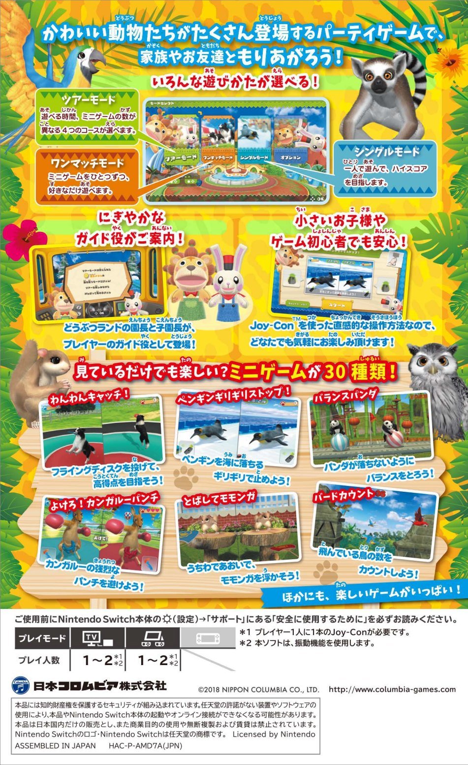 This game is a completely original family-friendly party game set in the adorable "Animal Land," where cute animals of all generations and genders come together. Enjoy 30 different mini-games that are simple yet exciting. The game supports TV mode for large-screen fun and Table mode for easy play anywhere. You can share Joy-Con controllers for two-player fun (with solo play modes also available).