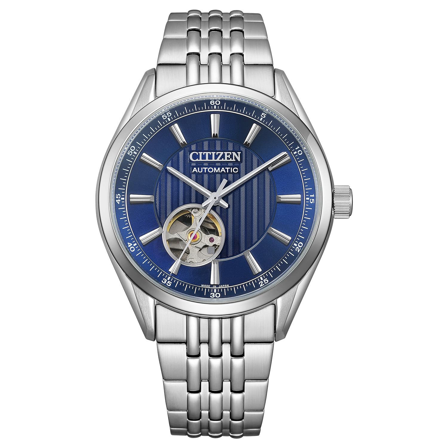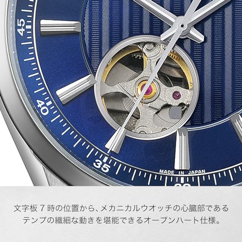 - Design: Open Heart feature at the 7 o'clock position to observe the delicate movement of the escapement. A vertical pattern from 12 to 6 o'clock creates a classic impression. Basic design with a metal band and black and blue dial.
