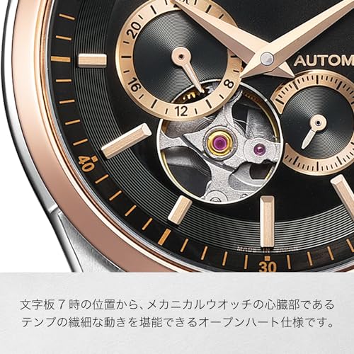 - Design: Features a three-dimensional and robust design with two separate rings. Includes a sub-dial with a 60-second hand and an Open Heart feature at the 7 o'clock position to observe the delicate movement of the escapement. The see-through back allows viewing of the rotating weight and mechanical movements. Simple adjust feature for easy band size adjustments.