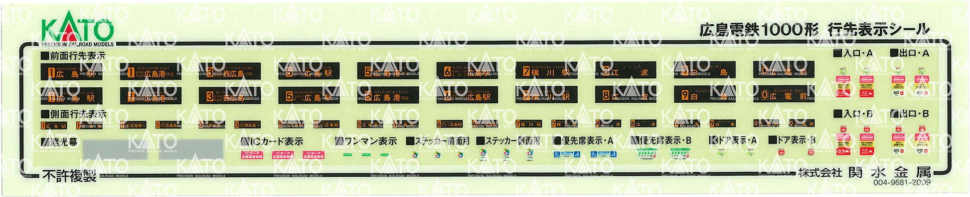 - Standard color (single item): Car number 1007, with a dark green belt on a white body. Front destination display is "1 Hiroshima Station." Comes with a destination display sticker including various types.