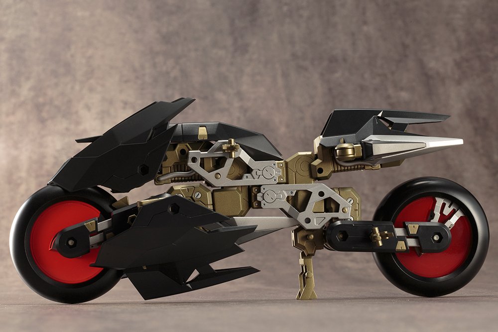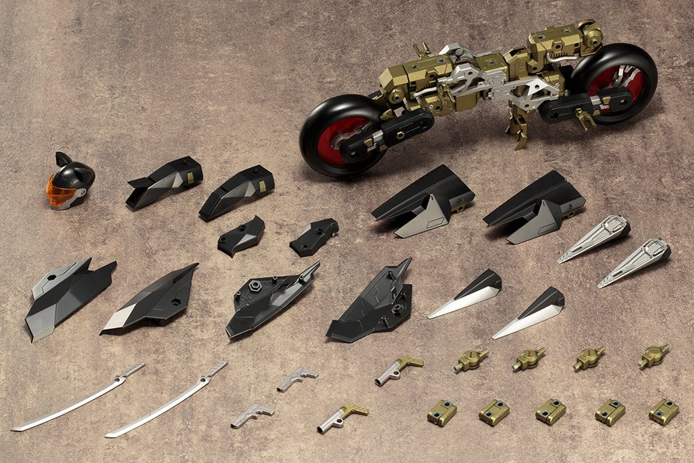This large combat bike from the Gigantic Arms series is compatible with 15cm characters such as Frame Arms or Frame Arms Girls. The armor on various parts can be removed and used with Frame Arms and Frame Arms Girls figures. Additionally, a helmet part is included that allows you to attach the expression parts from Frame Arms Girls, making it suitable for various situations. It also features a connector compatible with Hexa Gear, allowing cross-series interaction. You can combine it with the "Gigantic Arms 05 Convert Carrier" to form a massive combat mecha, the "Armed Breaker."