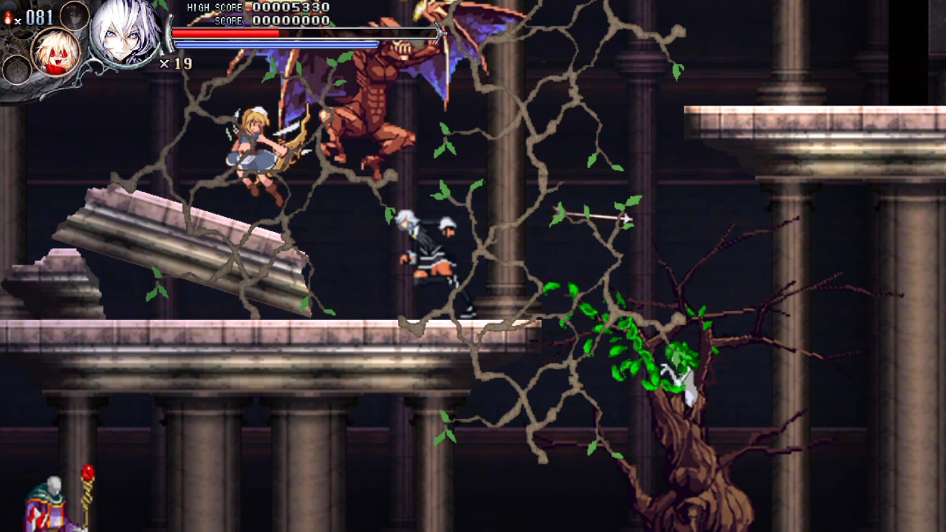 Sakuya specializes in close-range attacks with knives and can use the new action "Backstep" along with "Flight" to evade enemy attacks. The game features stylish new attacks like "Soul Sculpture," "Flying Kick," and "Backstep Knife," enhancing the gameplay.