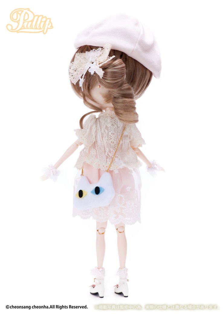 This Pullip doll, Glen, from the renowned Thai artist Happydolly/Memento, known for their unique makeup techniques, is a collaboration that's making waves. Glen and her twin, Cathy, are shopping enthusiasts with sparkling eyes reminiscent of shoujo manga characters. Dressed in a cute hat and lace dress, Glen always carries her adorable cat plushie along on their outings.