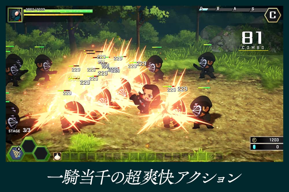 - Description: A hack-and-slash and belt-scroll action game based on the world of the movie "Shin Kamen Rider," featuring a mix of SD (Super Deformed) characters, a deep upgrade system, and the thrill of taking down dozens of enemies at once. Enjoy the nostalgic portrayal of "SD Shin Kamen Rider Ranbu" as you fight to stop SHOCKER's ambitions.