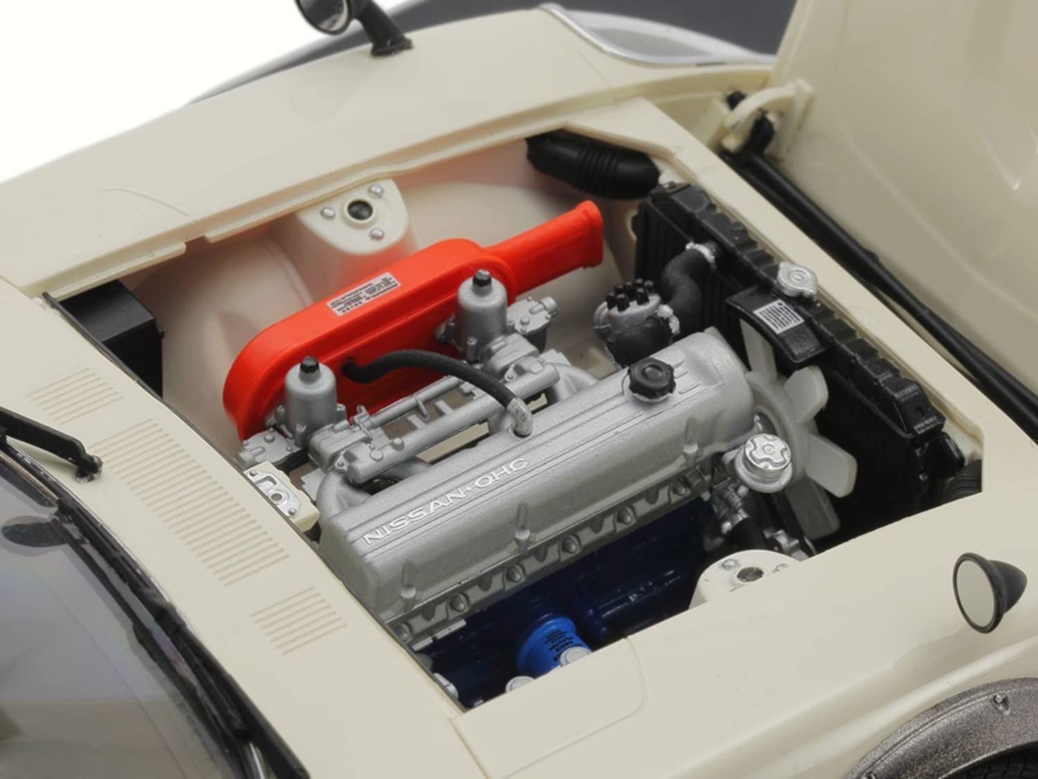This 1/24 scale, fully assembled plastic model measures 179mm in length, 71mm in width, and 53mm in height. It replicates the fastback coupe form of the actual car with a Grand Prix White body color. The model includes a finely detailed 2.4-liter inline 6-cylinder engine, with accurate reproduction of components such as twin carburetors and the oil pan. The bonnet is operable, allowing for engine inspection. Chrome parts are used for the window trim and headlamp covers. The model is finished with careful paintwork and includes RS Watanabe 8-spoke wheels, a base with a nameplate, and a clear case for dust protection.