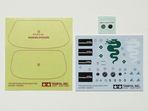 The Tamiya 1/24 Sports Car Series No. 188 Alfa Romeo Giulia Sprint GTA model kit accurately reproduces the distinctive "Dantsuki" bonnet design. The opening hood reveals the detailed 133-horsepower, four-cylinder DOHC engine, meticulously modeled for realistic representation. The kit includes chrome parts for the bumpers, with an option to display a custom look by removing them. Window mold masks, mirrors, and emblems are also included for added detail.