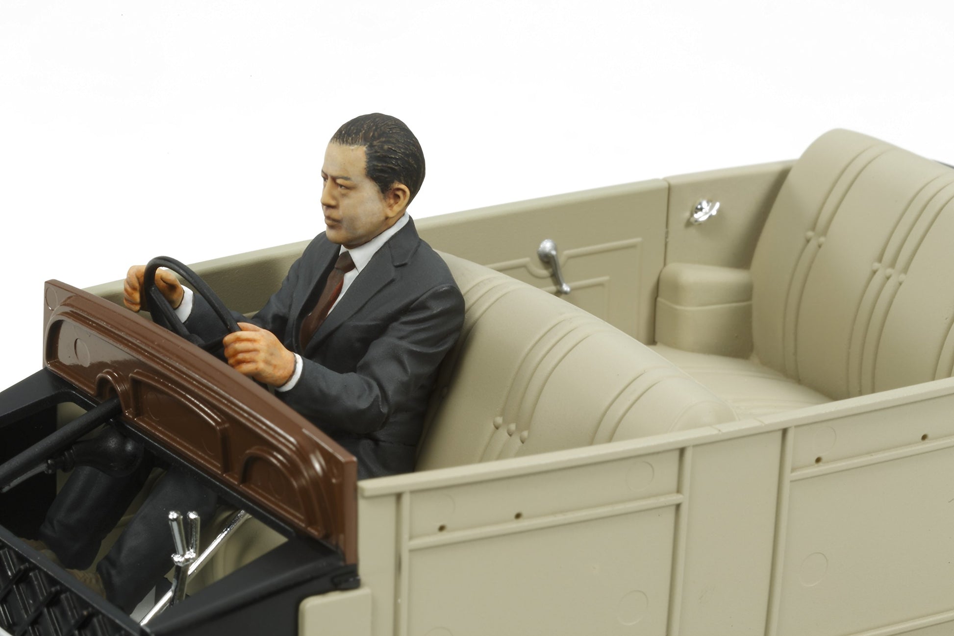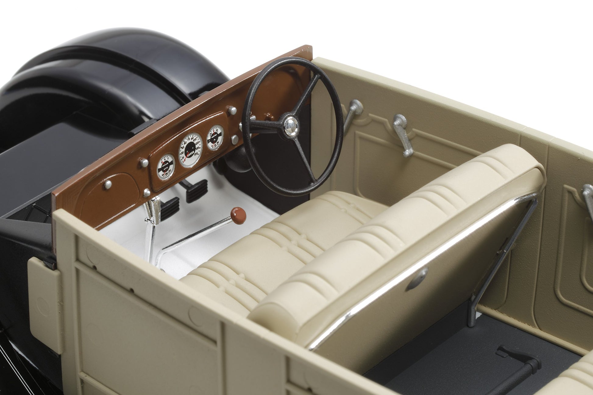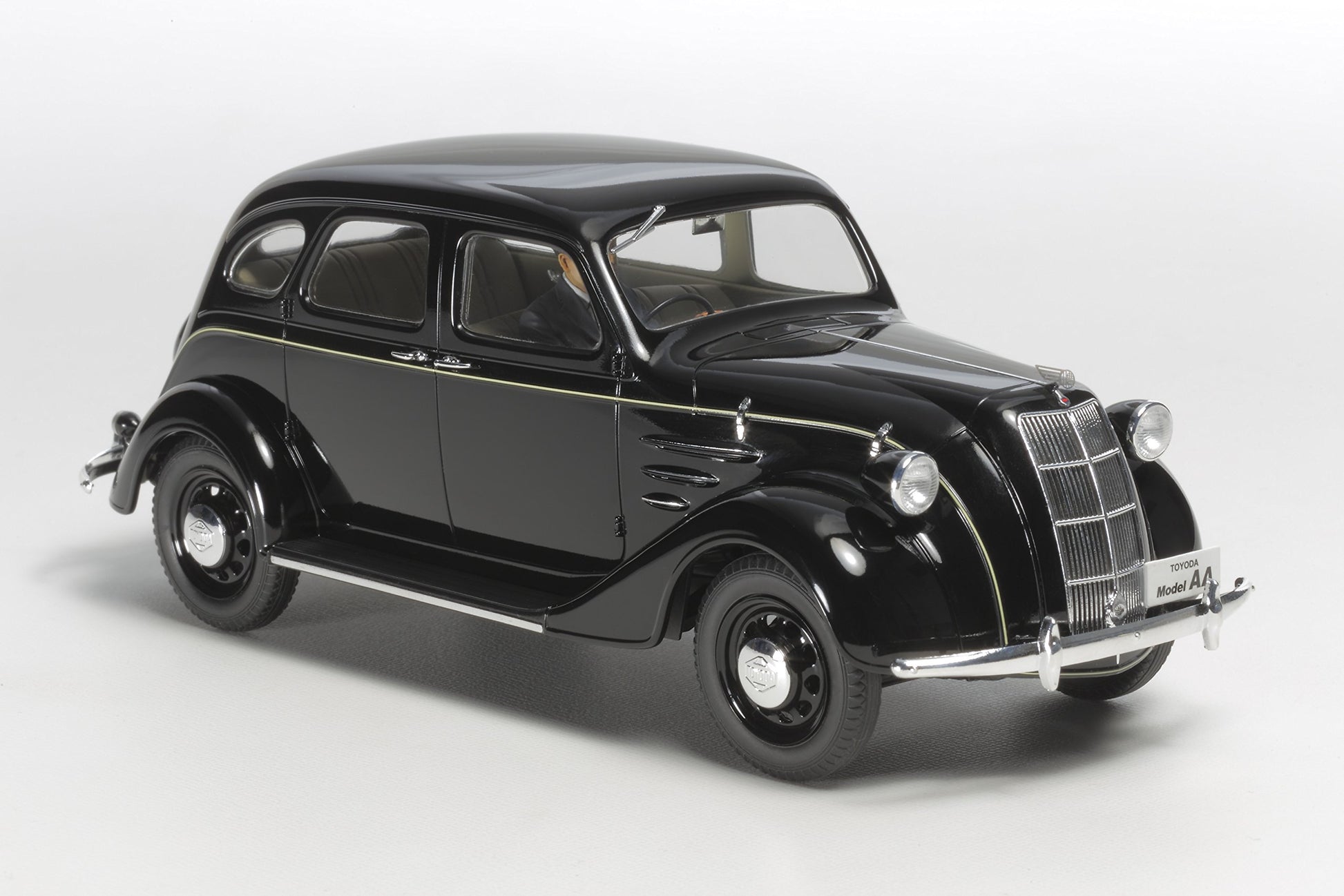 1/24 scale assembly kit of the Toyota AA, Toyota's first mass-produced passenger car, introduced in 1936. Realistically replicates the elegant streamlined appearance with rounded front grille and smooth curves of the front and rear fenders. Includes chrome-plated parts for bumpers and front grille. Detailed modeling of the frame, lower engine, and suspension. The hood crest mark is provided as an etching part.